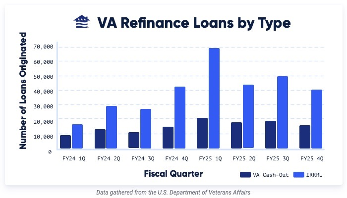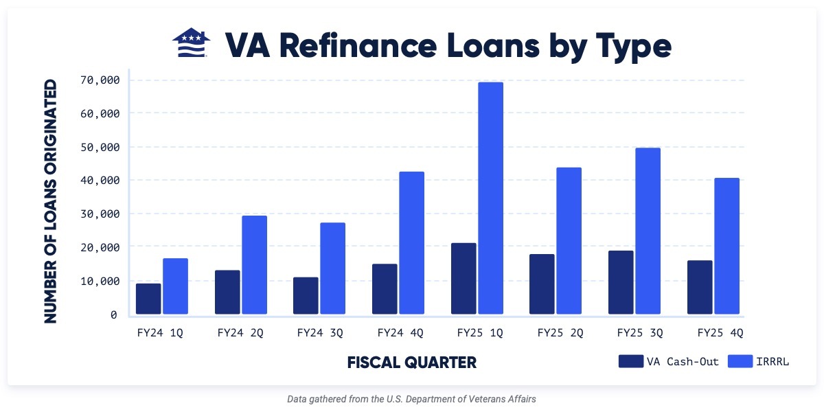 The chart below shows how Veterans have chosen between VA Streamline (IRRRL) and VA Cash-Out refinances over the 2024 and 2025 fiscal years.